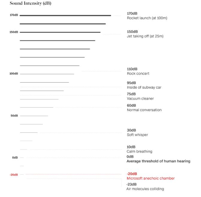▲聲音分貝對(duì)照表。平靜呼吸聲的噪聲有10分貝,輕聲講話的噪聲有30分貝,而微軟消音室的分貝已經(jīng)接近空氣分子碰撞產(chǎn)生的噪聲(負(fù)24分貝)。